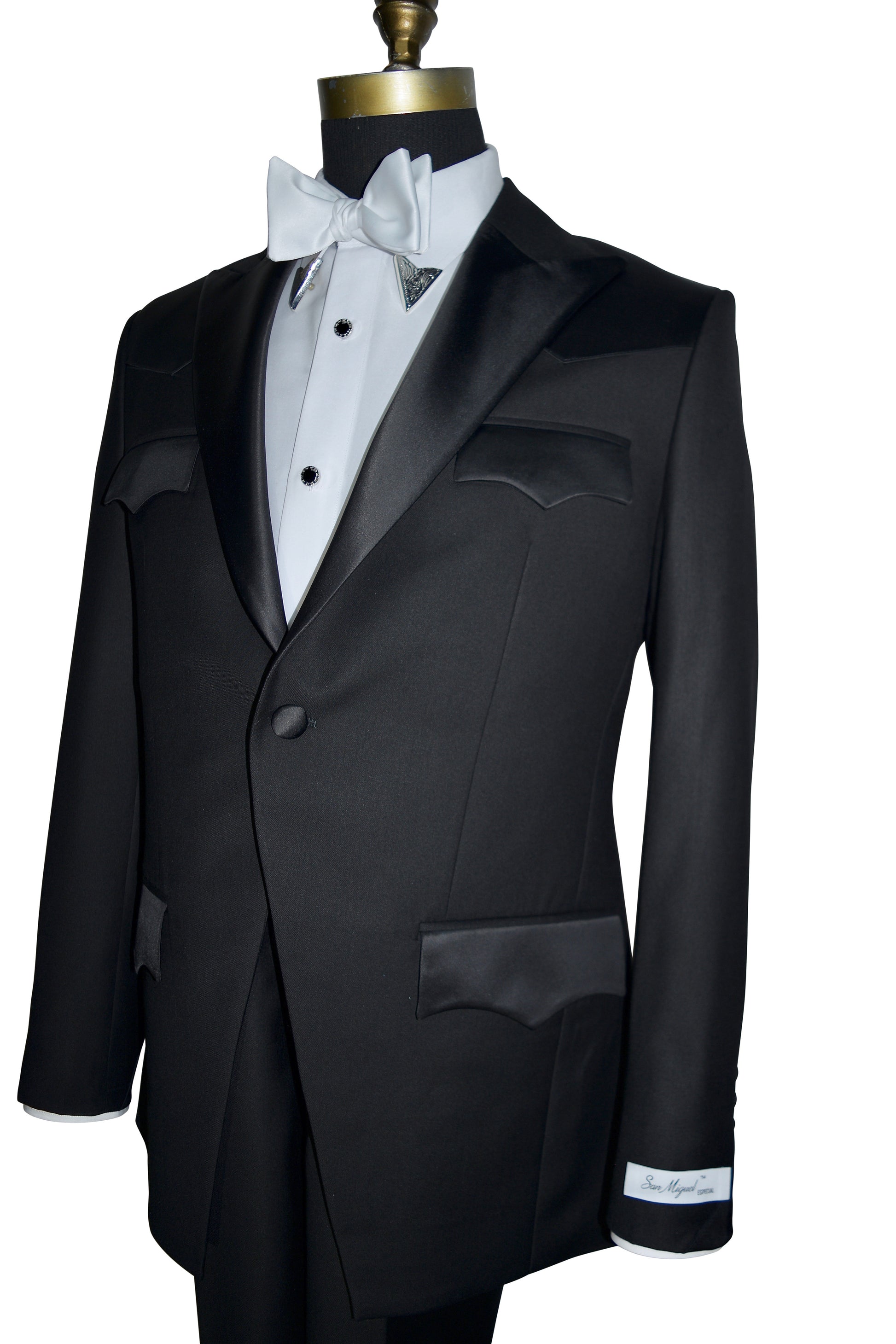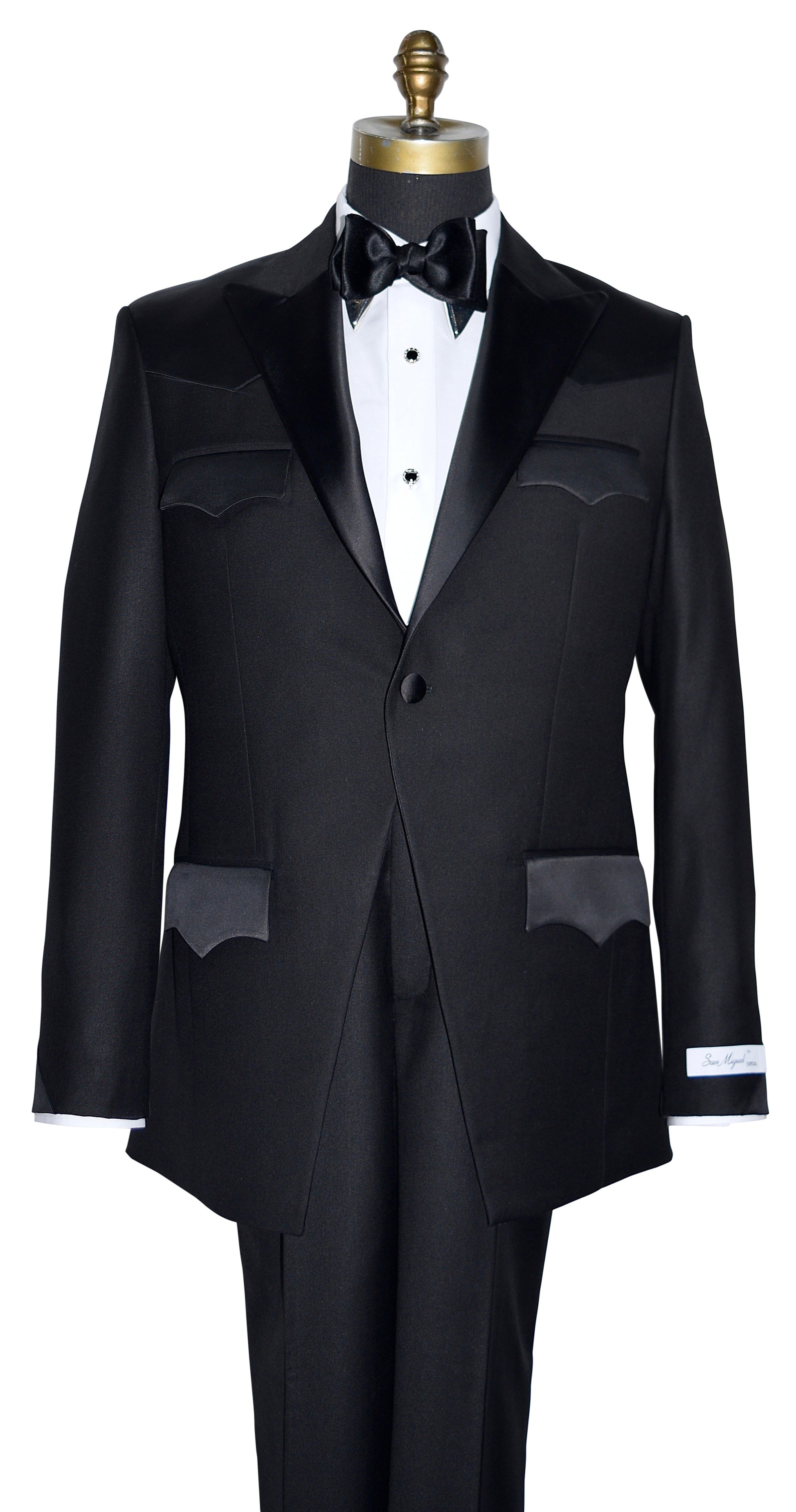 Western tuxedo configured in the shorter version. Satin trimmings that define western style and elegance.